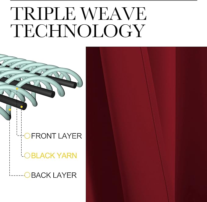 - MULTI-FUNCTION: Super heavy and soft Blackout Curtain Panels are very upmarket. Besides, 85%-99% light blocking, thermal insulated, soundproof, Fade-resistant, energy-efficient. Thread trimmed and wrinkle-free, both sides are the same color.