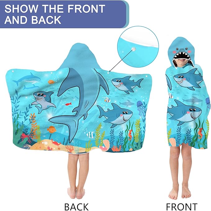 - [SAND FREE AND STYLISH]: The sand will disappear when you shake this towel. Don’t worry to take sand at home; The fun shark teeth kids hooded bath towel is printed single side with stylish design, you are absolutely unique on the beach