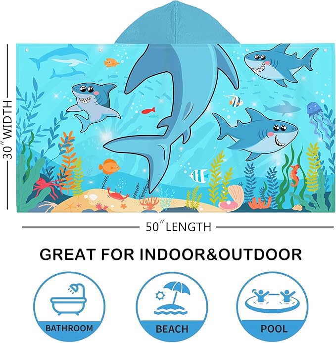 Shark Hooded Beach Towel for Kids, Cool Ocean Fishes Bath Towel with Hood for Boys, Funny Sea Animals Microfiber Super Absorbent Soft Poncho Bathrobe for Swin Pool 30”x50”
