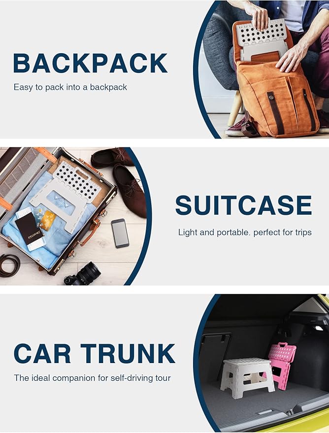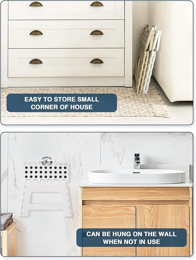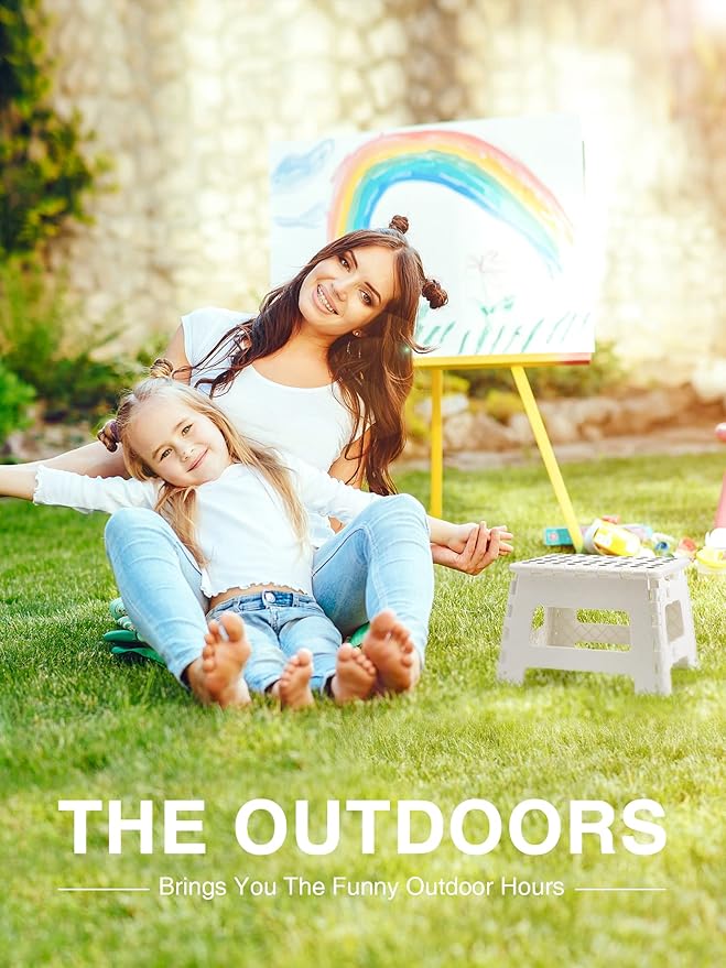 - ANTI-SLIP RUBBER BASE: Special rubber dots on the surface and an anti-slip black rubber strap on each foot provide maximum foot grip and comfort while preventing slippage. The folding step stool's unique, grip-dot textured surface makes it safe for everyone.