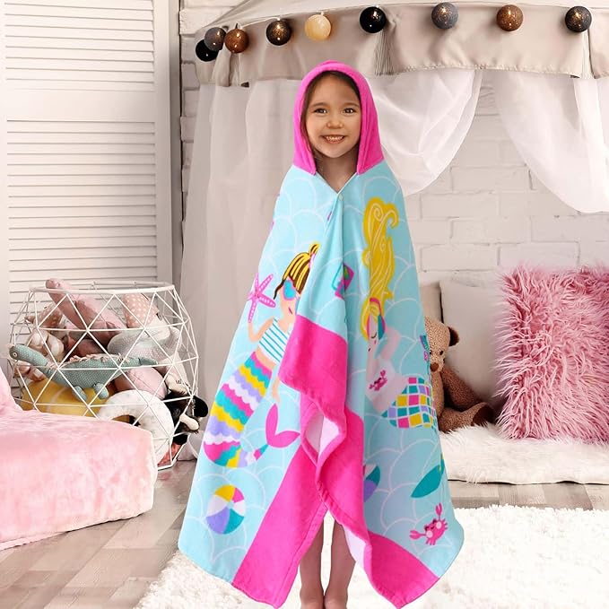 - THE MERMAID BEACH TOWELS : This Hooded COTTON towel wraps adopts an environmentally friendly Printing, the mermaid music party elements make kids towel so gorgeous and mermaid and her friends attractive that can get children’s love at once! The bright color seahorse ocean elements absolutely lovely and make your littles stands out from bath beach or pool
