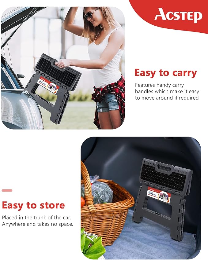 - 【Folding Stool Space Saving And Easy to Carry】:ACSTEP collapsible step stool is only 1.5 inches thick when folded that is easy to store in any small corner of home,And the folding stool of the weight is 2.58 lb,Lightweight that Portable to Carry Out