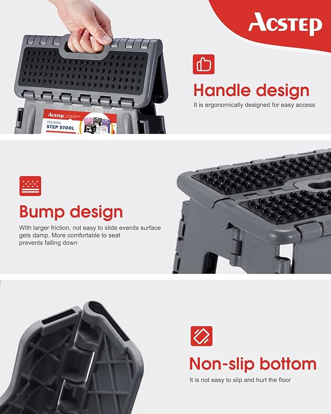 - 【2022 Safe Upgrade Step Stool】: ACSTEP folding stool 2021 Upgrade designed a safety stop gap feature that allows the foldable stool to prevent being squashed,And unique embossing design provides comfortable to sit sn and Non-Slip
