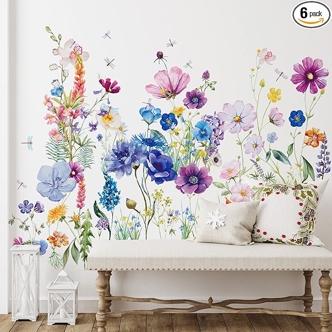 Zonon Flowers Wall Decals Vinyl Dragonflies Flowers Wall Stickers Removable Floral Wall Murals Peel and Stick Colorful Flower Wall Decor for Bedroom Living Room Nursery(Beautiful)