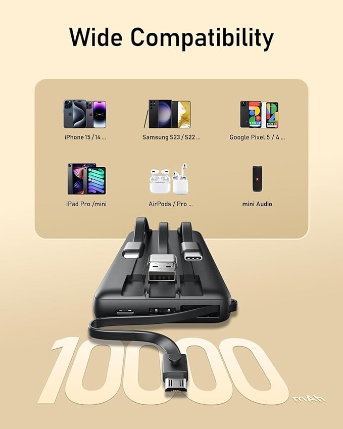 - [ Portable charger Built in Cables ] This built in cables portable charger power bank features built-in iPhone, USB-C, and USB-Micro cables, making it a one-stop solution. This portable charger power bank is universally compatible with popular smart devices, including the iPhone 15/14/13/12/11/8/7 series, XR, XS Max, Samsung Galaxy S24/S23/S22/S21/S10/S9/S8/Galaxy Z Flip/Z Fold/Galaxy A51/52/53/54/55/Note 20/10, Google Pixel series, and many more smartphones and USB-C devices