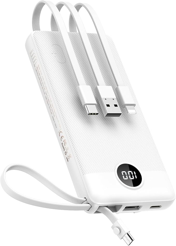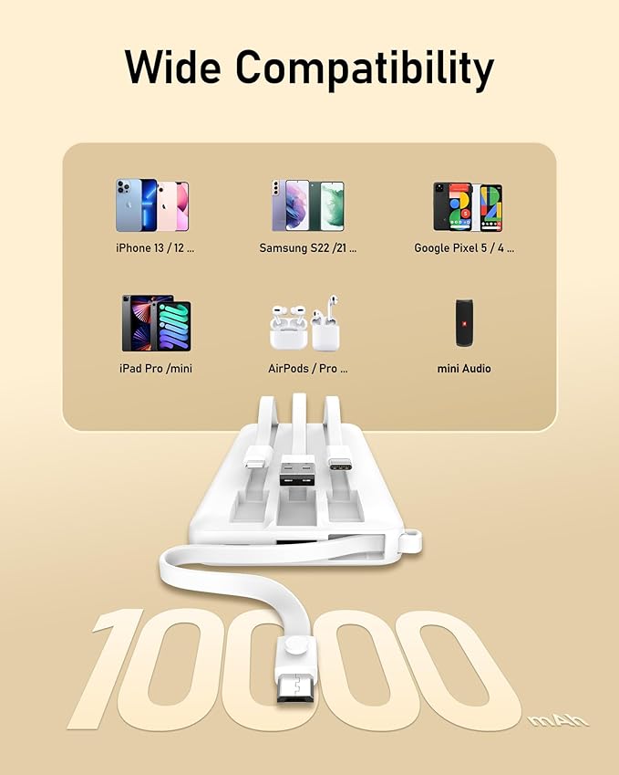 - [ Portable charger Built in Cables ] This built in cables portable charger power bank features built-in iPhone, USB-C, and USB-Micro cables, making it a one-stop solution. This portable charger power bank is universally compatible with popular smart devices, including the iPhone 15/14/13/12/11/8/7 series, XR, XS Max, Samsung Galaxy S24/S23/S22/S21/S10/S9/S8/Galaxy Z Flip/Z Fold/Galaxy A51/52/53/54/55/Note 20/10, Google Pixel series, and many more smartphones and USB-C devices