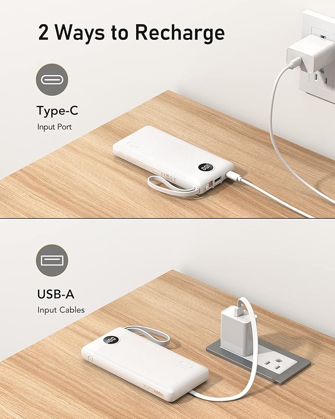 - [ Portable Battery with Dual USB Recharging ] This small portable charger USB C offers two recharging methods: you can conveniently charge the battery pack by plugging the built-in USB cable into a USB base, or by inserting an additional USB-C charging cable into the USB-C port on the battery bank