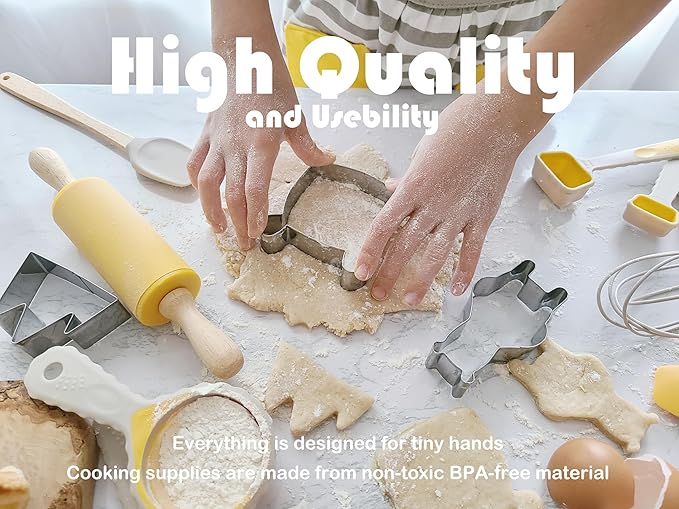 - 🎂 Kids Cooking Sets That Teach Valuable Skills: Help your little one develop dexterity, learn crucial math skills and improve sensory learning, all while enjoying quality bonding time. Bake ooey gooey cookies together, create fun-shaped PBJ sandwiches, decorate tasty cupcakes and more. The creative possibilities are only limited by what you and your kiddo can dream up!