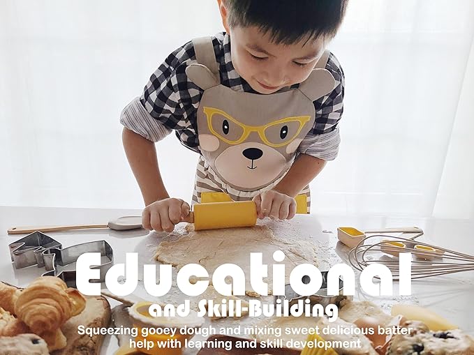 - 🎂 Includes Super Cute Teddy Bear Apron: “Mom and dad get their own kitchen apron so why don’t I?” With an adorable teddy bear apron, copyright design, they’ll never feel left out of the cooking fun again! Your little one will fall in love with the padded ears, charming teddy glasses and comfy cotton feel. Plus, with a neutral gray and yellow design, it’s the perfect kids apron for boys and girls.