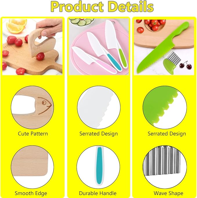- What is Include: You will receive 1 piece of fish wood kids knife, 1 piece of plastic potato slicer, 1 piece green cooking knife and 3 pieces serrated edges toddler knives, meet your children daily different usages or demands