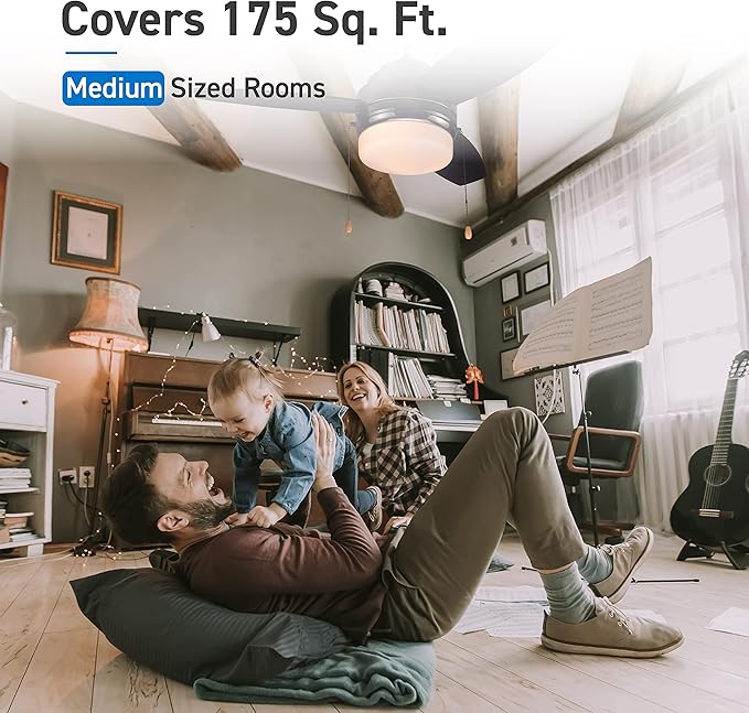 - COVERS 175 SQUARE FEET: This modern ceiling fan with lights ensures cool and breezy air in rooms up to 175 sq. ft. Perfect for medium-sized living rooms, bedrooms and kitchens. Enjoy a quiet motor that creates breezy air without excess noise.