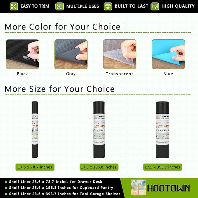 - MULTIFUNCTIONAL LINERS: Hootown shelf liner mats 17.5 Inch Wide x 32.8 Feet Long is trimmable for 13, 14, 15, 16, 17, 18 inches wide drawer, cabinet of kitchen, RV. It not only can be used as a kitchen liner to ensure the cleanliness of home and kitchen, but also can as a refrigerator mat to keep the freshness of food and fruits. More can be used as cabinet mats, drawer liner, cupboard pad, desk liners, table pads, shelve, counter top etc.