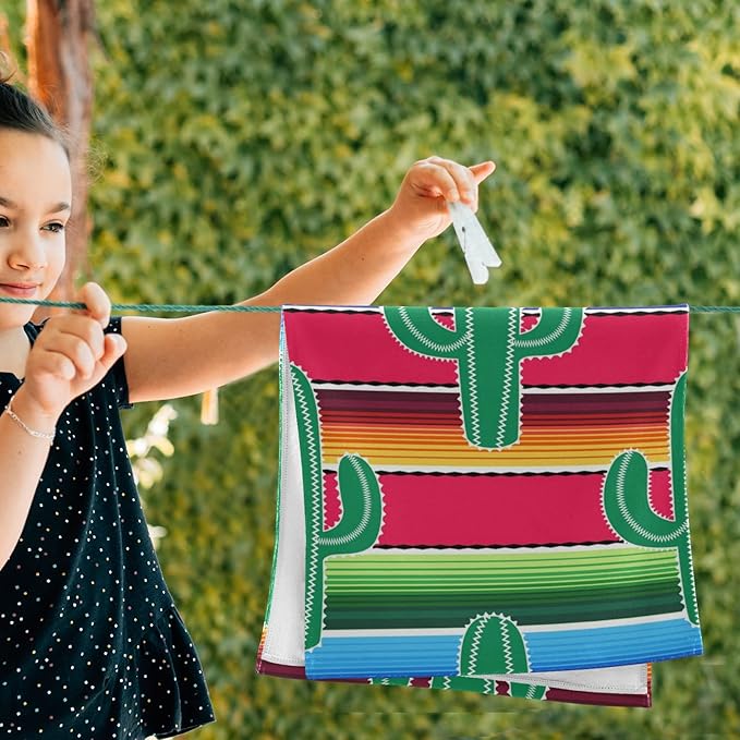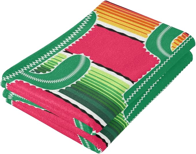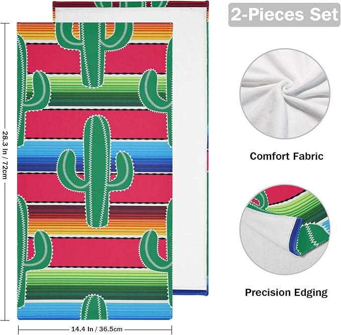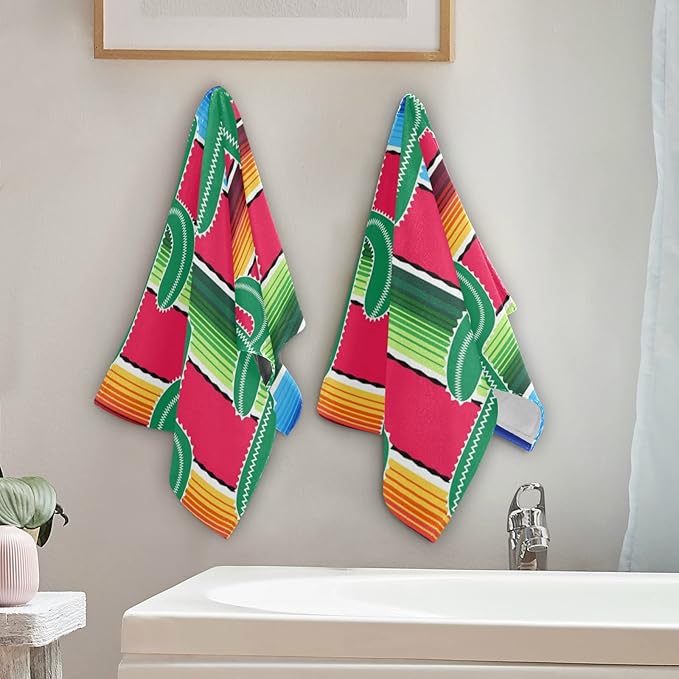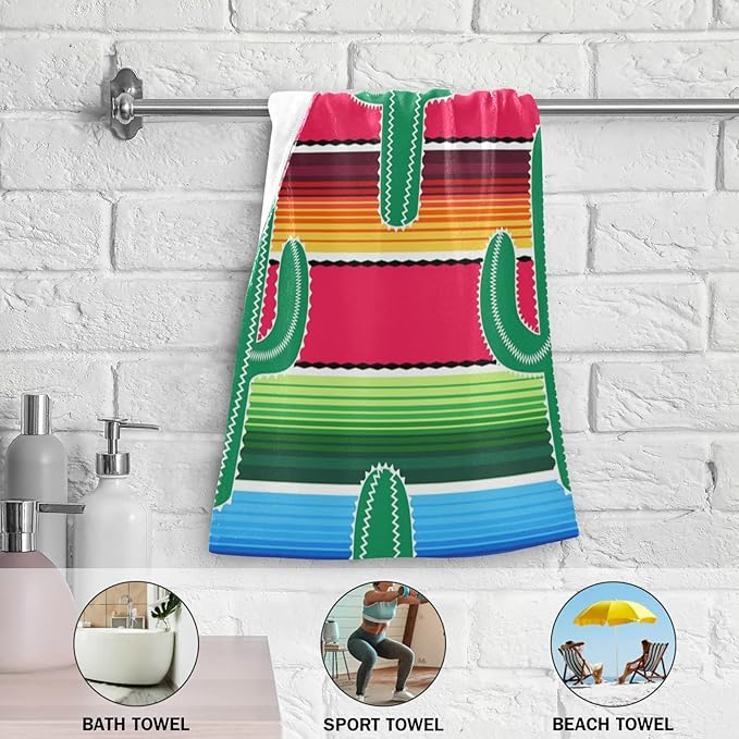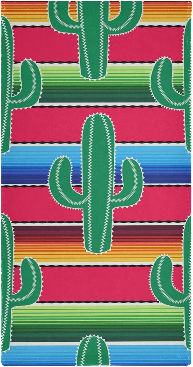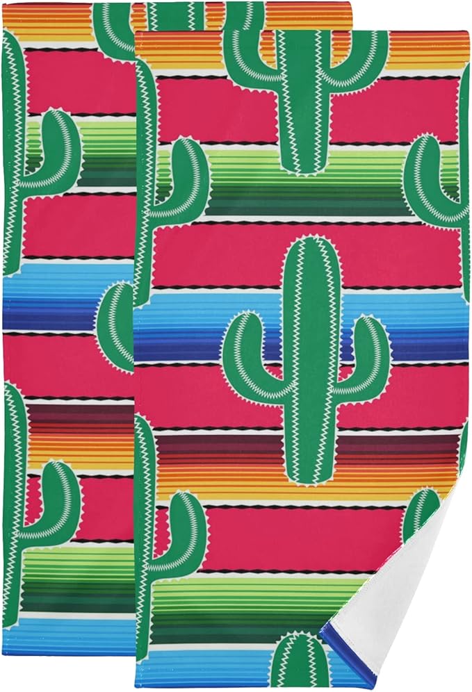 Towel Sets 2 Pack, Green Cacti on Colorful Stripes Bath Hand Towels Soft Absorbent Quick Dry for Bathroom Beach Kitchen Gym Travel
