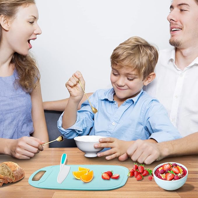 - 💖 EXCELLENT LITTLE CHEF CHOOSE KIDS SAFE CUTTING KNIVES: Every crafting is the beginning of a story. Every child has a brave heart. They can also exercise their skills of cutting and eating by themselves, as well as their interest in vegetables and fruits, they want to work in the kitchen by themselves and don 't have to worry about accidents, because this kind of children's plastic knife and cutting board make Children can participate in your kitchen activities and make them independent chefs!