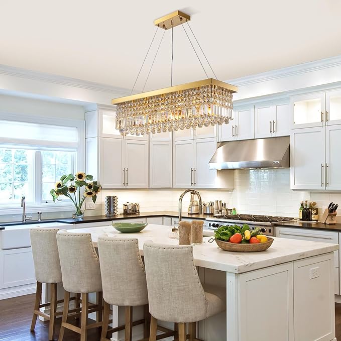 - ✨【Modern Gold Crystal Chandelier】: This modern gold rectangle K9 crystal raindrop chandelier combines simple & minimalist elements which provides sophisticated ambiance and creates a attractive atmosphere in your house. Suitable for dining room, living room, kitchen island, bathroom, bedroom, pool table, office, entry, foyer, office, etc.
