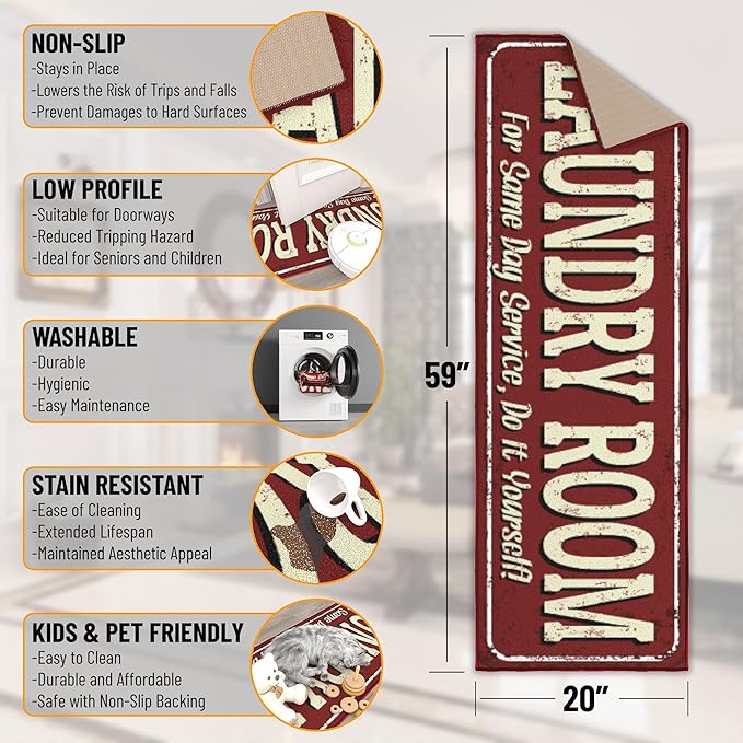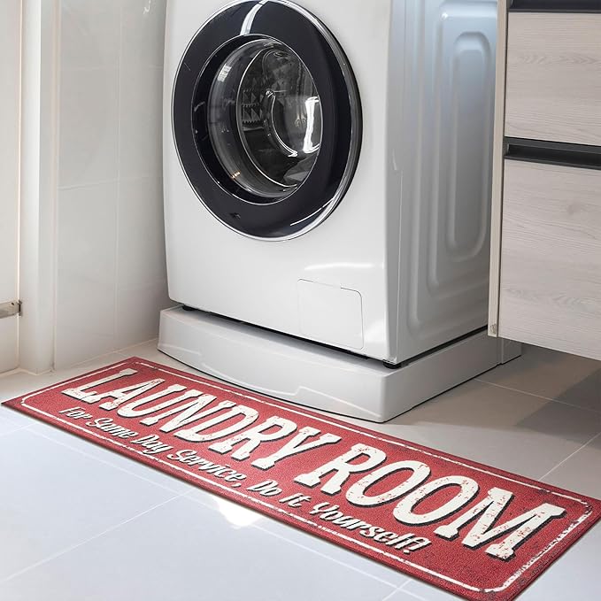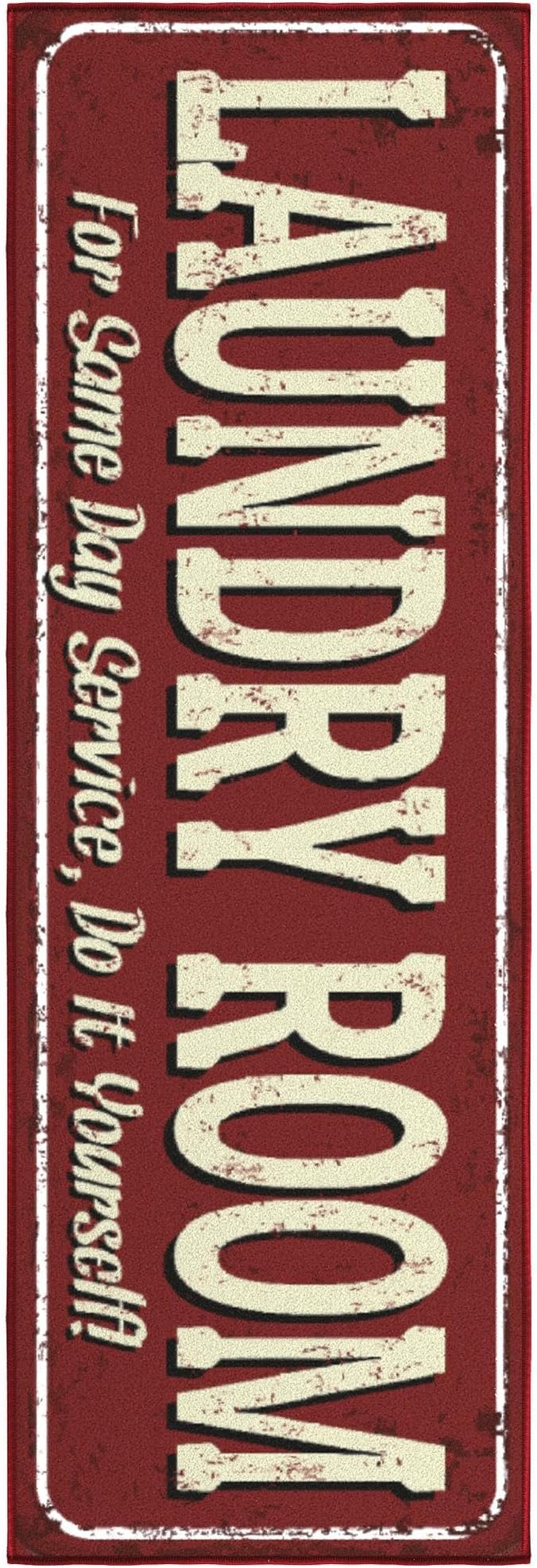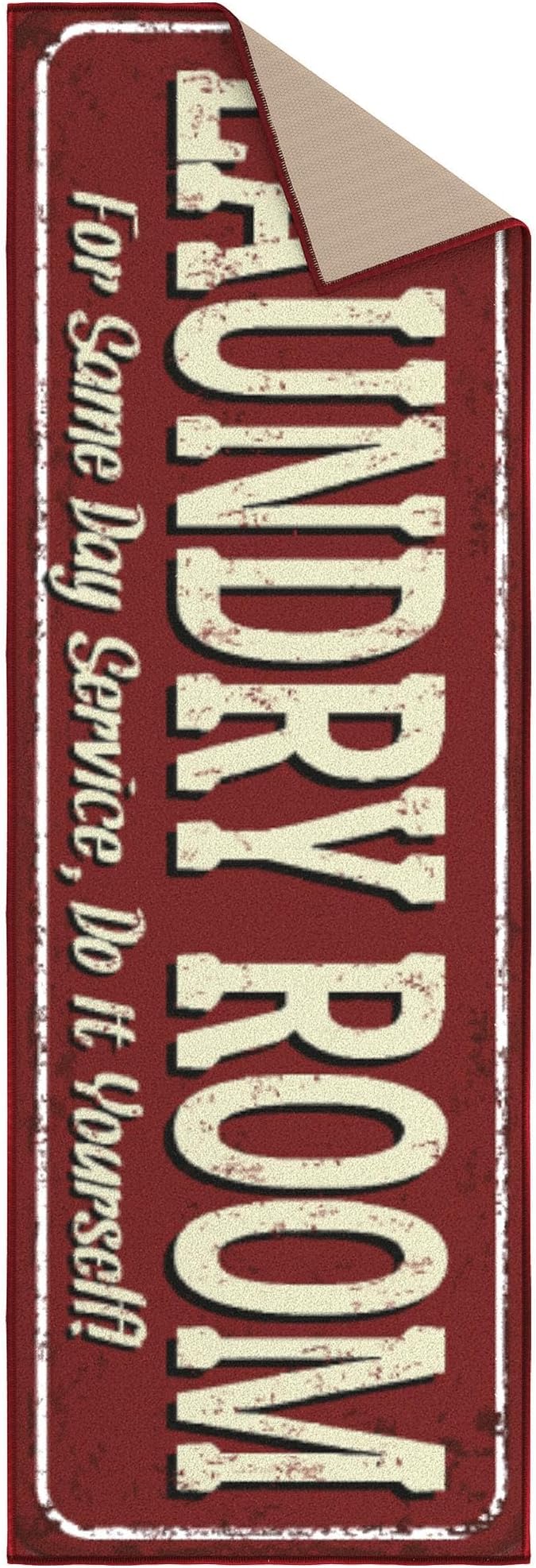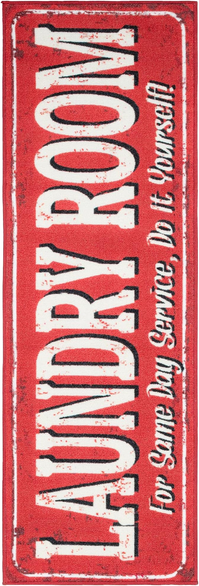 - [TRENDY STYLE]: This Colorful Laundry Text Design Runner Rug features solid red background with laundry room text adding color and enhancing the look of your home. Its timeless design can be integrated into a variety of home décor styles.