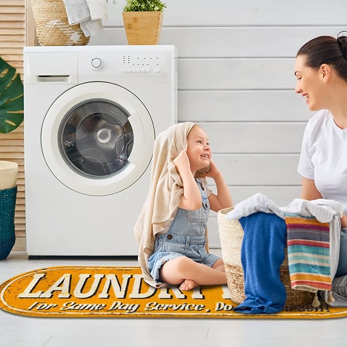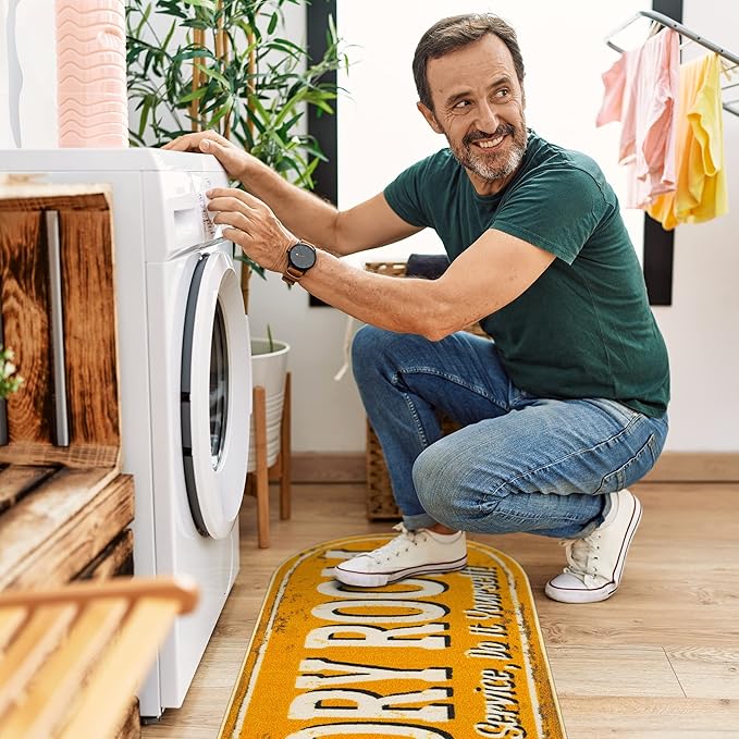 - [TRENDY STYLE]: This Colorful Laundry Text Design Runner Rug features solid orange background with laundry room text adding color and enhancing the look of your home. Its timeless design can be integrated into a variety of home décor styles.