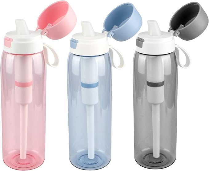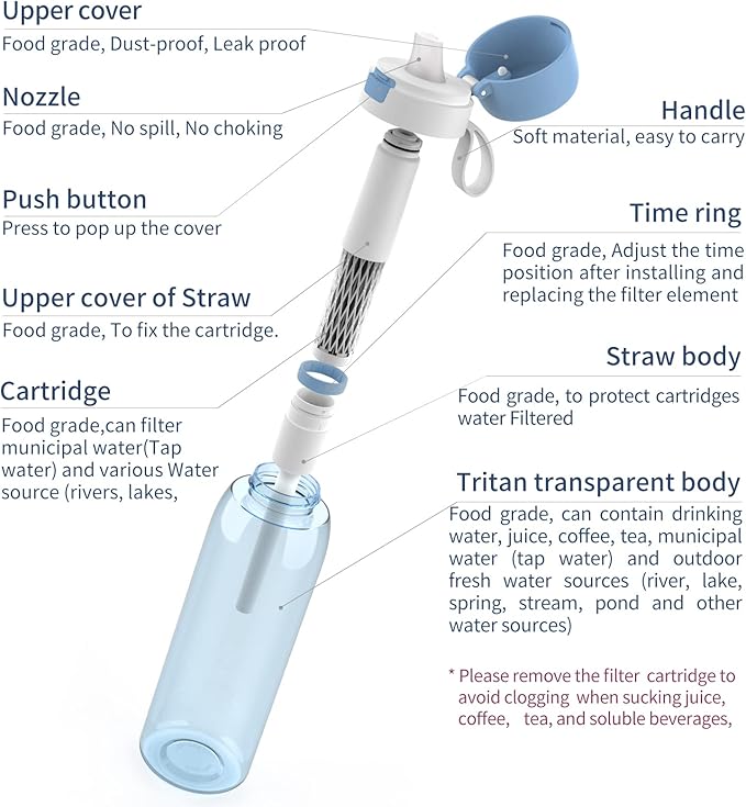 - Healthier and Safer: The filtering water bottle is Reusable and durable, made from Food-grade Tritan material, features a food-grade silicone mouthpiece. BPA-free, without any bad smell. It has the advantage of high heat resistance, excellent hydrolysis resistance. Tested to meet FDA, NSF/ANSI and EU LFGB standard.