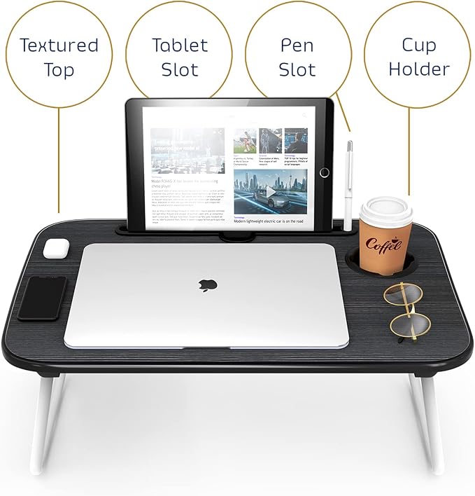 - BONUS LAPDESK: The laptop desk features a cup, pen, and tablet holder so you can keep your stuff neat in one place. The desktop measures 19” x 11.75”. Use it as a laptop workstation, laptop table for bed, a children's bed table, a mini writing table, laptop couch table, or a standing table for office work. It becomes the great balance for relaxing and productivity.