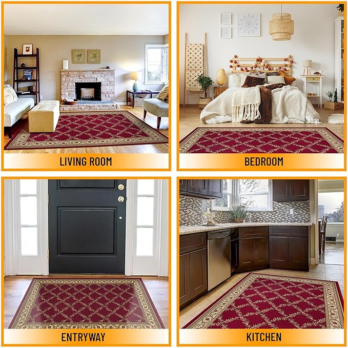 - [TRENDY STYLE]: This Colorful Trellis Design Area Rug features a solid Red Trellis background with a trellis design adding color and enhancing the look of your home. Its timeless design can be integrated into a variety of home décor styles.