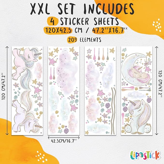 Unicorn Wall Decals for Kids by Lipastick - 209 pcs Unicorn Wall Stickers Peel and Stick - Wall Decals for Girls Kids Baby Nursery Bedroom - Kids Colorful Decals Glittered Moon Stars Clouds XXL Size