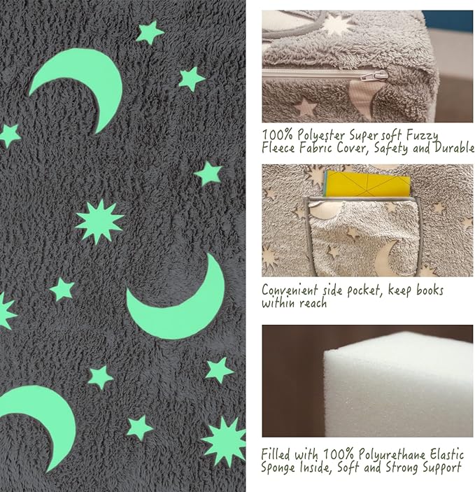- Cute Design: Glow in-the-dark design on the kids couch will create a world that kids can enjoy. Having snacks, watching TV, readings or just lay down to rest. The side pockets can store books and toys, keep their precious within reach. It's also light enough for the kids to fold by themselves, any time any where.