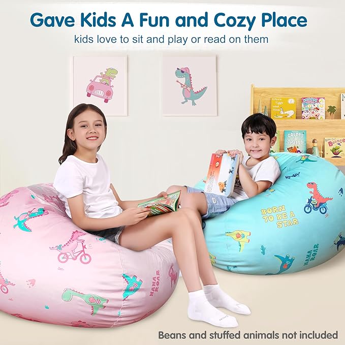 Lukeight Stuffed Animal Storage Bean Bag Chair Cover for Kids, Dinosaur Zipper Beanbag Chair Cover for Organizing Toddler and Kids' Rooms Plush Toys (Dino Pink, X-Large)