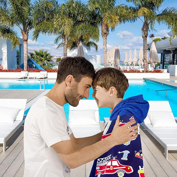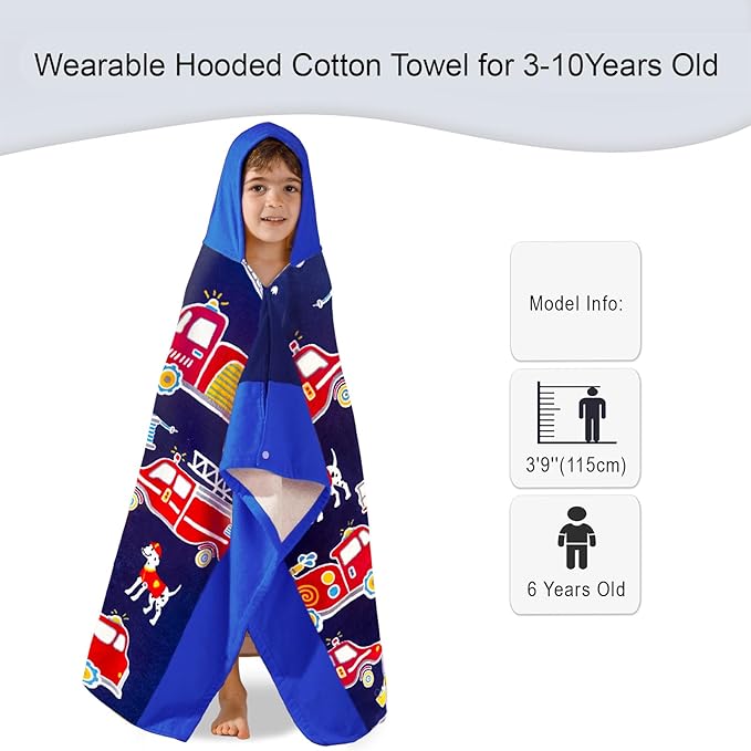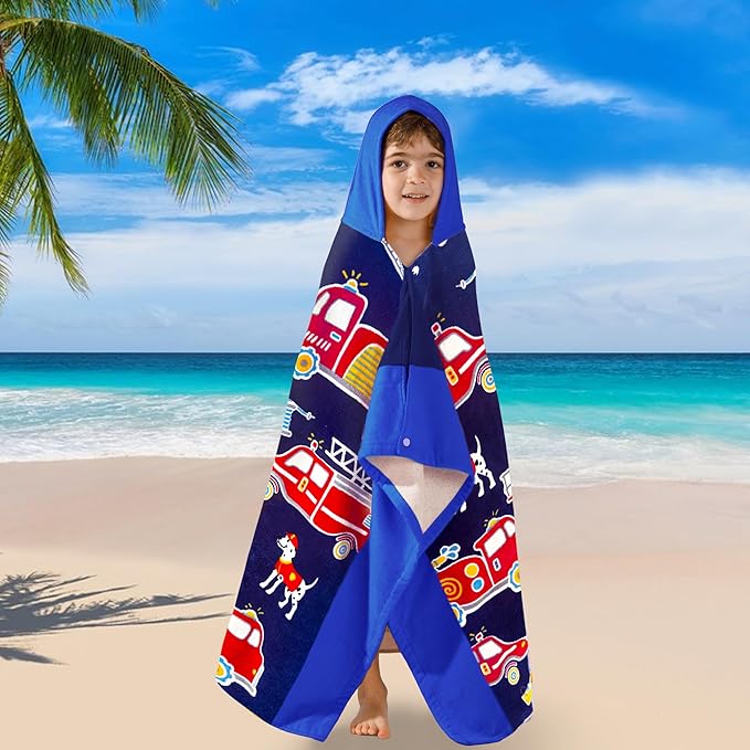 - FIRE TRUCK BEACH TOWELS This Hooded COTTON : towel wraps adopts an environmentally friendly Printing, the fire truck cars make kids towel so gorgeous and and be kids costume cape attractive that can get children’s love at once! The Fire Truck Fans absolutely love this and make your little stands out from bath beach or pool