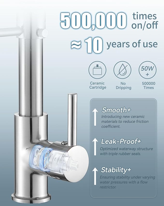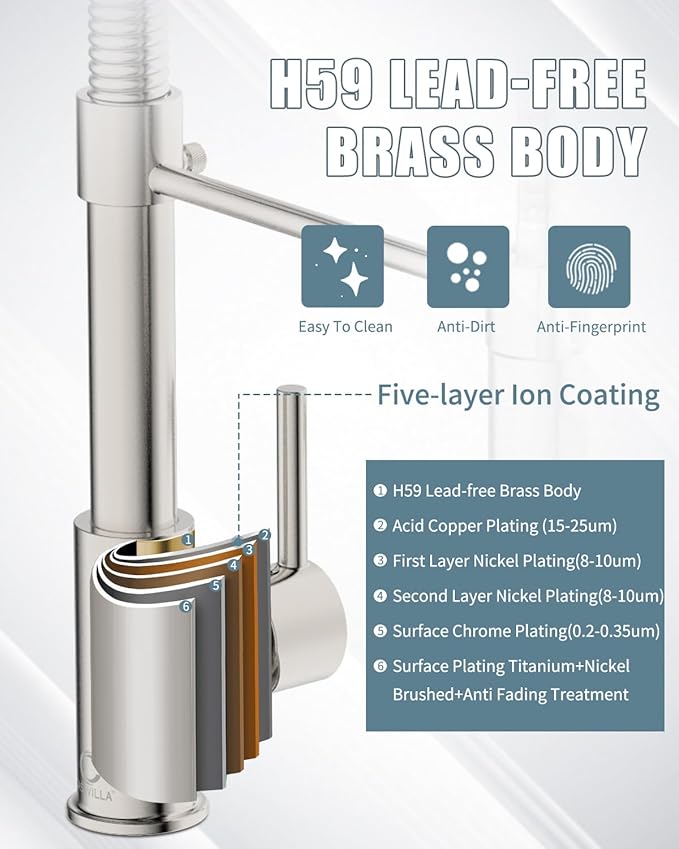 • 【EASY MAINTENANCE】Lead-free solid brass body and commercial SUS 304 stainless steel spring construction forged products. Nickel Brushed surface treatment added 18/8 Chromium/Nickel content provides a superior anti-corrosion and anti-rust finish that prevents dirt such as fingerprints or water stains from adhering to the faucet surface, making the kitchen look cleaner. Daily cleaning with a cloth or water is enough, less time cleaning and more time having fun with your family.