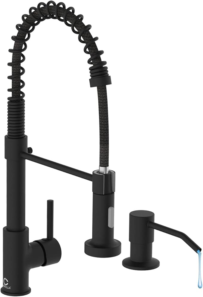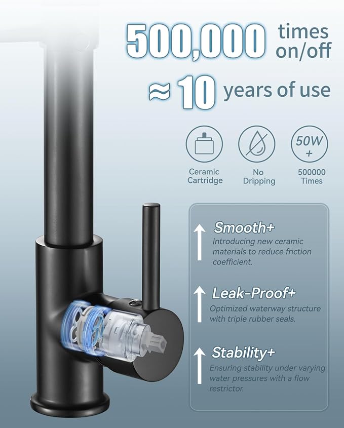 - 【EASY MAINTENANCE】Lead-free solid brass body and commercial SUS 304 stainless steel spring construction forged products. Matte Black surface treatment added 18/8 Chromium/Nickel content provides a superior anti-corrosion and anti-rust finish that prevents dirt such as fingerprints or water stains from adhering to the faucet surface, making the kitchen look cleaner. Daily cleaning with a cloth or water is enough, less time cleaning and more time having fun with your family.