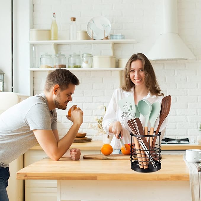 RedCall Utensil Holder for Kitchen Countertop,Metal Spatula Holder,Cooking Utensil Holder for Spoon,Wire Utensil Organizer,Stainless Steel Round Utensil Caddy Crock Flatware Storage Counter (Black)