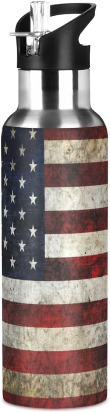 ALAZA American Flag Patriotic Water Bottle With Straw Lids Boys Girls,Vacuum Insulated Leakproof Stainless-Steel Sports Bottle Thermal Flask For Gym Yoga Camping,20Oz (600Ml)