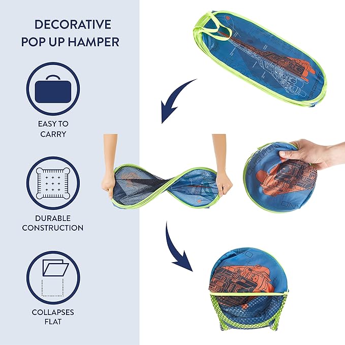 - DURABLE CONSTRUCTION: This Hamper is made from nylon fabric and has reinforced handles for easy carrying. An easy light weight hamper to transport around the house. This hamper is made with breathable, polyester mesh sides to complete its design. This pop up kids hamper is super lightweight. This pop up hamper easily folds down and can be stored flat when not in use. This pop up hamper keeps a good shape allowing the hamper to stand upright even when its empty.
