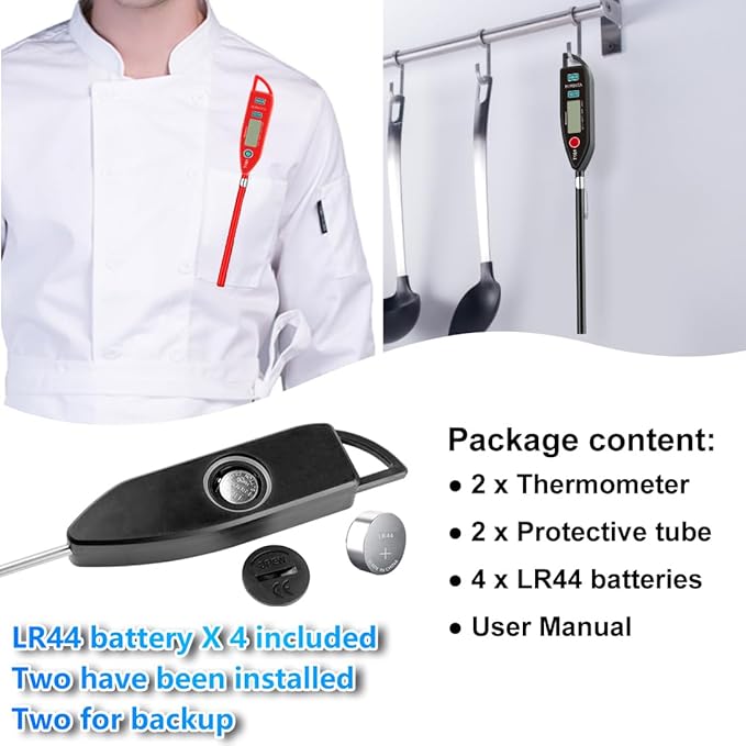 - [ Long Probe Probe protection tube with clip With Backup Battery ] The 5 inch long probe is made of food-safe 304 stainless steel. Package Contents: 2x Thermometer(Black and Red); 2 x Probe protective tube with clip; 1x Instruction Manual (Warranty); 4x (LR44) Batteries (Two of the batteries have been loaded into two thermometers each. The other two are for backup.)