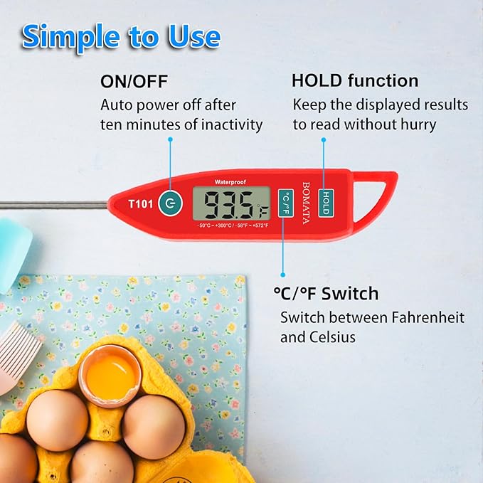 - [ EASY TO USE ] Power on and insert the probe into the target, then get results quickly. Switchable between Fahrenheit and Celsius. The HOLD function can hold the results to read without hurry. Auto off after 10 minutes of inactivity to save power.