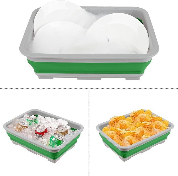 - WASH BASIN SET OF TWO – These versatile bins can be used for a variety of tasks at home and on the go. Each collapsible dish tub can be used as an ice bucket, camping sink, for gathering and rinsing fresh produce, as a cleaning caddy, car wash bucket and more.
