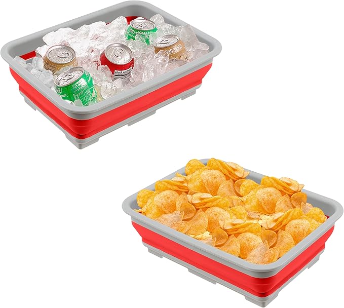 - PRODUCT DETAILS – Materials: Plastic and Plastic Rubber. Dimensions: (L) 14.75” x (W) 10.75” x (H) 5”; Collapsed: (H) 2”. Capacity: 7.27-Liters. Set of 2. May be shipped in separate packages. Color: Red.
