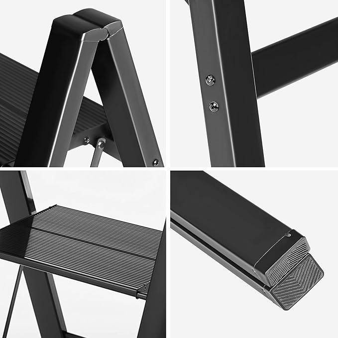 - Anti-slip & Dirt-Resistant Design, Wide Pedal: Wide pedals of the step stool are covered with Non-slip grooves and Anti-dirt coating. You can get enough friction from the step ladder to prevent accidental slipping. Four ladder feet of the 2 step folding ladder are equipped with non-slip rubber, fit the ground 100%. Not only to reduce wobble, but also protect your precious floor.