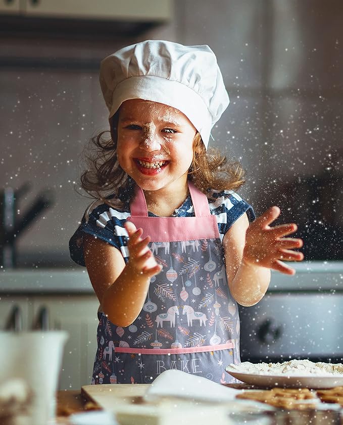 - Kids aprons with adjustable neck strap and tie waist for cooking and baking plus a 5--piece cookie cutter set that iIncludes a set of 4 cookie cutters and 1 spatula