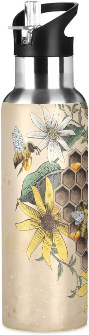 ALAZA Honey Bee Retro Floral Water Bottle With Straw Lids Boys Girls,Vacuum Insulated Leakproof Stainless-Steel Sports Bottle Thermal Flask For Gym Yoga Camping,20Oz (600Ml)