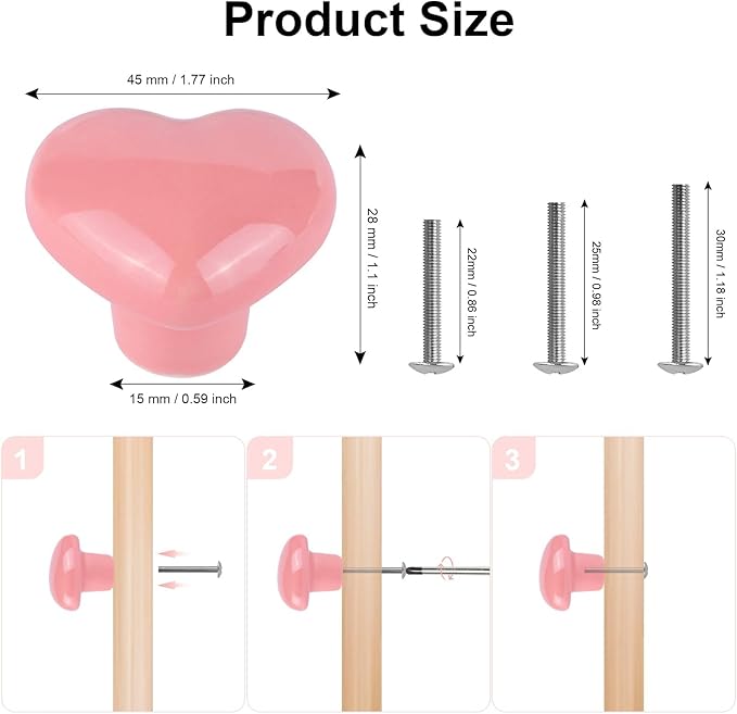 - 10 Colors: Beige, Red, Pink, Pale Pinkish, Light Pink, Blue, Light Yellow, Blue-green, Light Purple, Light Grey; Knob Size: approx. 1.77*1.1*0.59inch. Each sweet door knob comes with 3 sized M4 mounting screws in length: 22/25/30mm; Suitable for 15-25mm thickness board, which can satisfy your different installation needs.