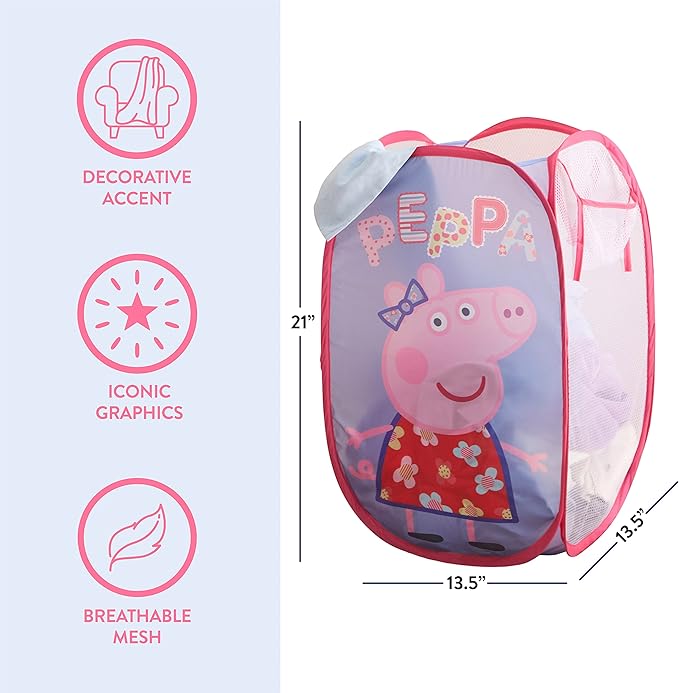 - DESIGN: Pop up hamper featuring Peppa Pig printed with iconic graphics from the famous brand. This pop up hamper features your child's favorite characters and will make an adorable addition to a bedroom or bathroom décor.