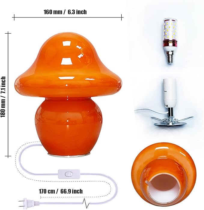 - 【Easy to clean, dust-proof design】:The glass mushroom table lamp is simple in structure, easy to operate and maintain. The one-piece closed glass design will not let dust enter the interior. The semi-circular top has a smooth appearance, not easy to accumulate dust, and easy to wipe.