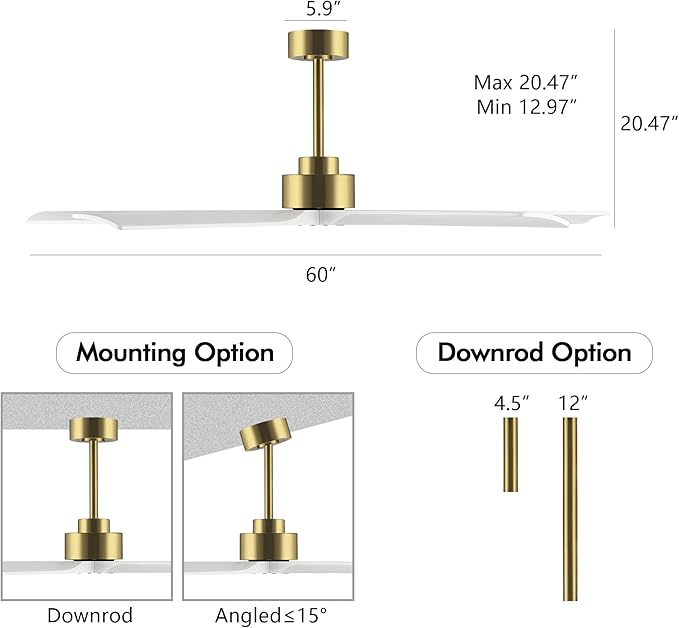 - 60 inch Ceiling Fans for Rooms: The ceiling fan no light suitable for indoor/covered outdoor, farmhouses, bedrooms, living rooms, dining rooms, kitchens, covered patios(not to expose to rain directly) and more. The 2 Down rods (4.5" & 12") suitable for ceilings tilting within 15°