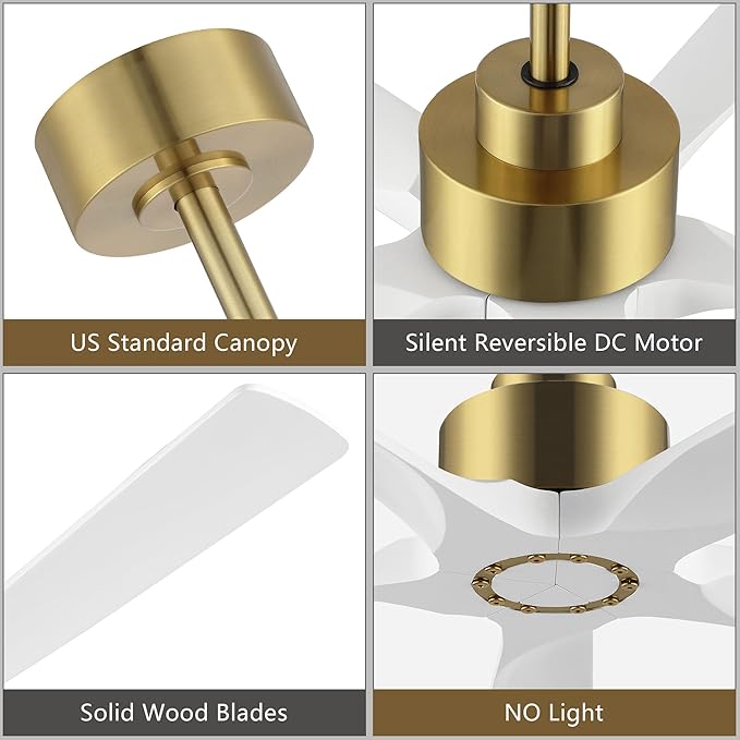 60 Inch Modern Ceiling Fan without Light, 5 Solid Wood Blades 6-Speed Noiseless Reversible DC Motor, Ceiling Fan with Remote Control for Bedroom Living Room, White Gold Finish