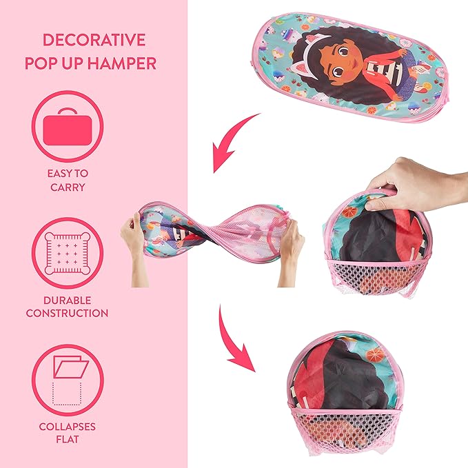 - DESIGN: Pop up hamper featuring fun and bright Gabby's Dollhouse graphics. This pop up hamper features your child's favorite characters and will make an adorable addition to a bedroom or bathroom décor.