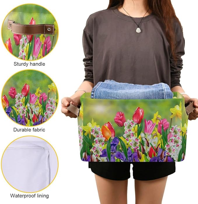Wamika Spring Tulip Lavender Flowers Storage Basket Fabric Laundry Baskets Green Leaves Herbs Storage Boxes Organizer Bag for Baby Cloth Dog Toy Book Storage Cubes Shelf Closet Bins 16x12x8 Inches