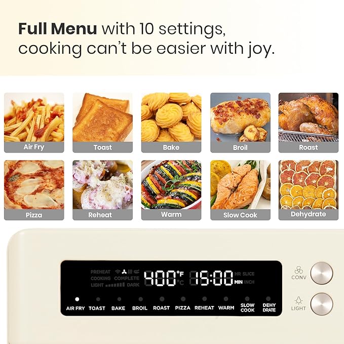 • [SUPER VERSATILE “10-in-1” AIR FRYER CONVECTION TOASTER OVEN] Unlike typical air fryer or oven with a single function, we take it up a notch by offering 10 preset digital functions that include Air Fry, Toast, Bake, Broil, Roast, Reheat, Warm, Slow Cook, and Dehydrate. This versatile 10-in-1 combination allows you to prepare a variety of dishes with ease and convenience, making your cooking experience more enjoyable than ever before.