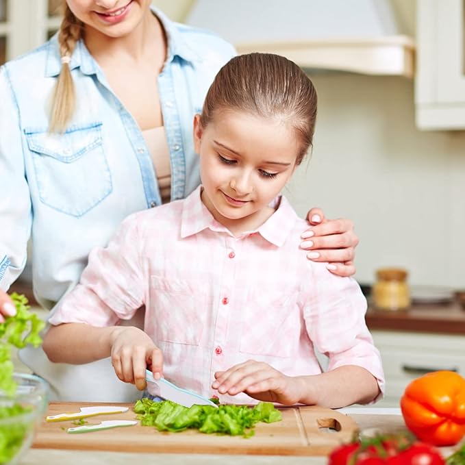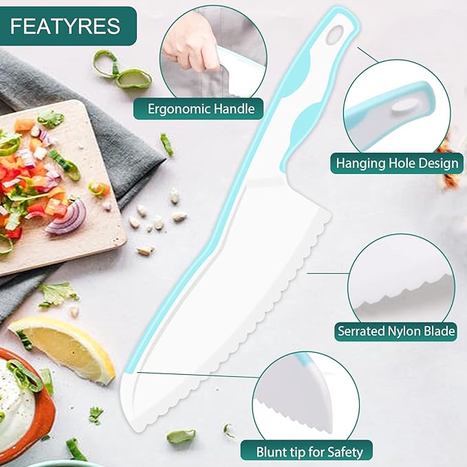 - 【MULTIPURPOSE KID SAFE KNIVES FOR CUTTING】- Our toddler knife can be used to chop vegetables for salads, slice fruits, cut through cheese, soft bread, lettuce, mushroom, and more with ease. Helping kids to get involved with food prep and develop essential kitchen skills. You can even use them to cut baked items(pies or cakes) in your nonstick pan.