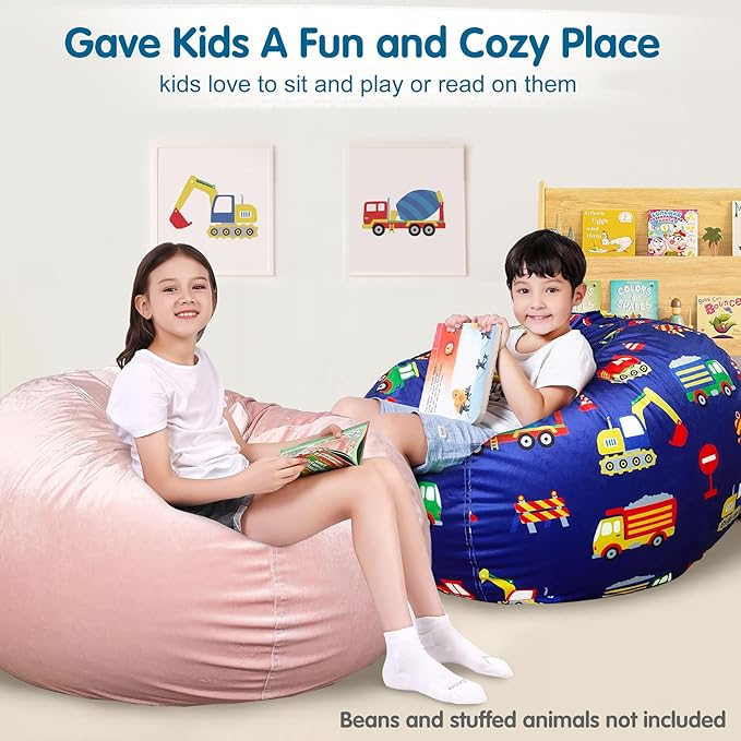 Lukeight Stuffed Animal Storage Bean Bag Chair Cover for Kids, Zipper Beanbag Chair Cover for Organizing Toddler and Kids' Rooms Plush Toys (Excavator Velvet, XX-Large)